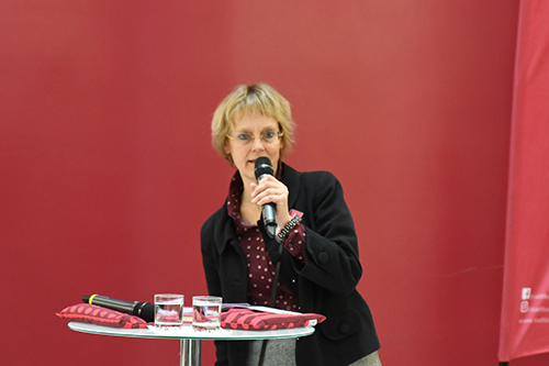 Sabine Baumann vom Vorstand des Vereins Frankfurt liest ein Buch, verwies darauf, dass in der Ausstellung auch ein Film über die vergangenen zehn Jahre Lesefest zu sehen ist. Zusammengestellt wurde er von Lothar Eichhorn.