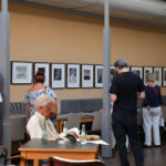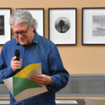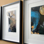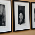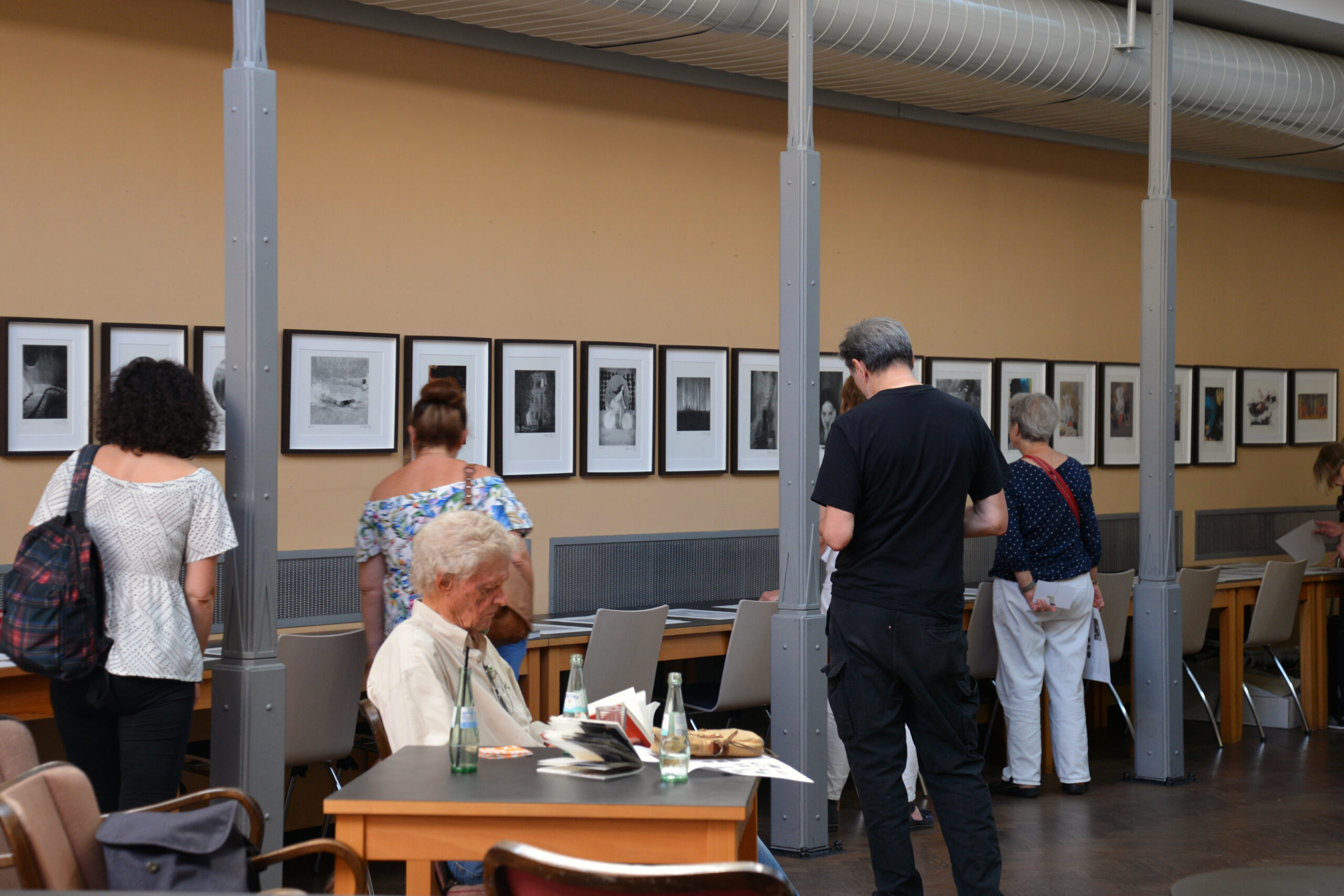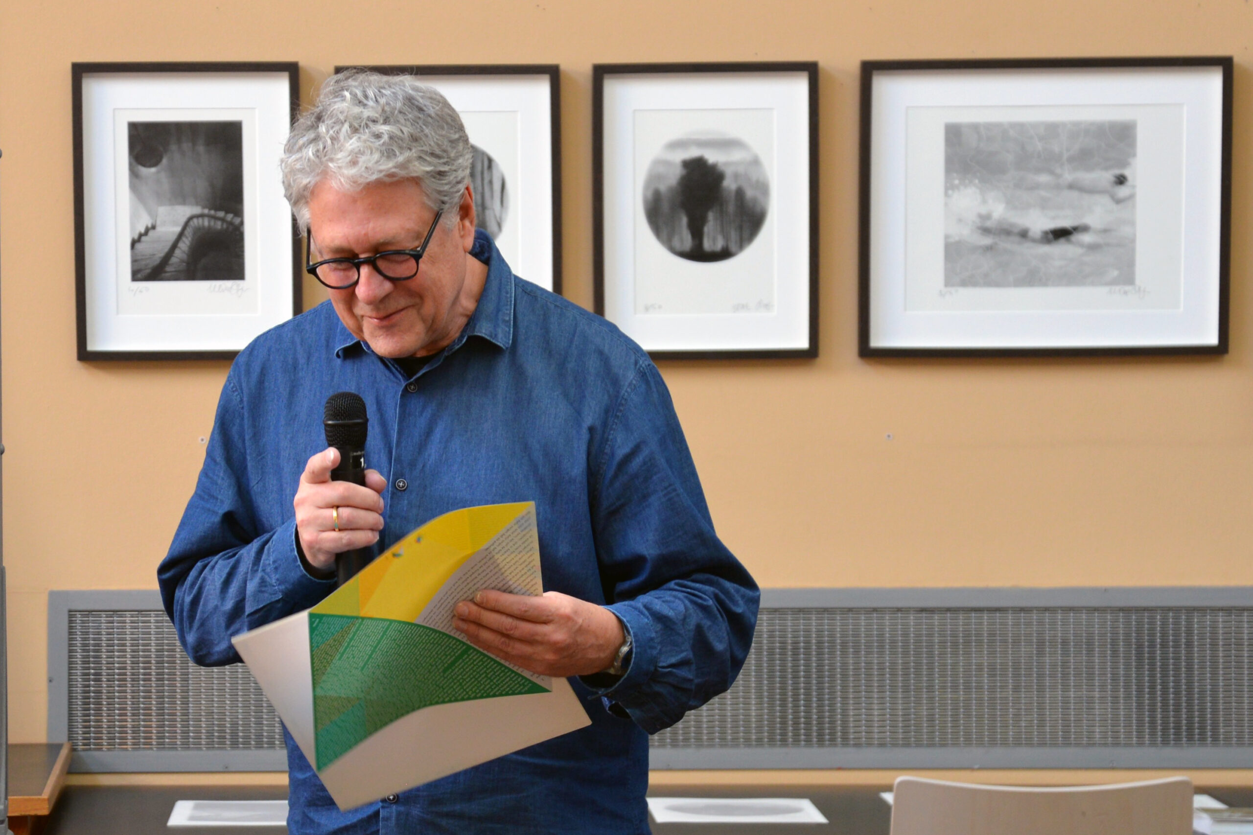 Heute Nachmittag wurde eine kleine, feine Ausstellung mit Bildern der Illustratorin Ulrike Möltgen im Heine Haus in Düsseldorf eröffnet. Rudolf Müller, der mit Selinde Böhm die Müller & Böhm Literaturhandlung im Heine Haus betreibt, erinnerte sich in seiner Ansprache daran, wie Ulrike Möltgen eines Tages – damals noch im Ladenlokal in der Neustraße – vor ihm stand und ihm eine Arbeit zu Gertrude Stein anbot. Das Blatt in einer Hülle sei etwas sperrig gewesen, erzählte der Buchhändler, aber auch interessant. Wenn er 50 Stück abnehme, habe sie eine Wette gewonnen, habe die Studentin von Wolf Erlbruch damals erklärt. Und dann habe er eben 50 Stück genommen.