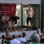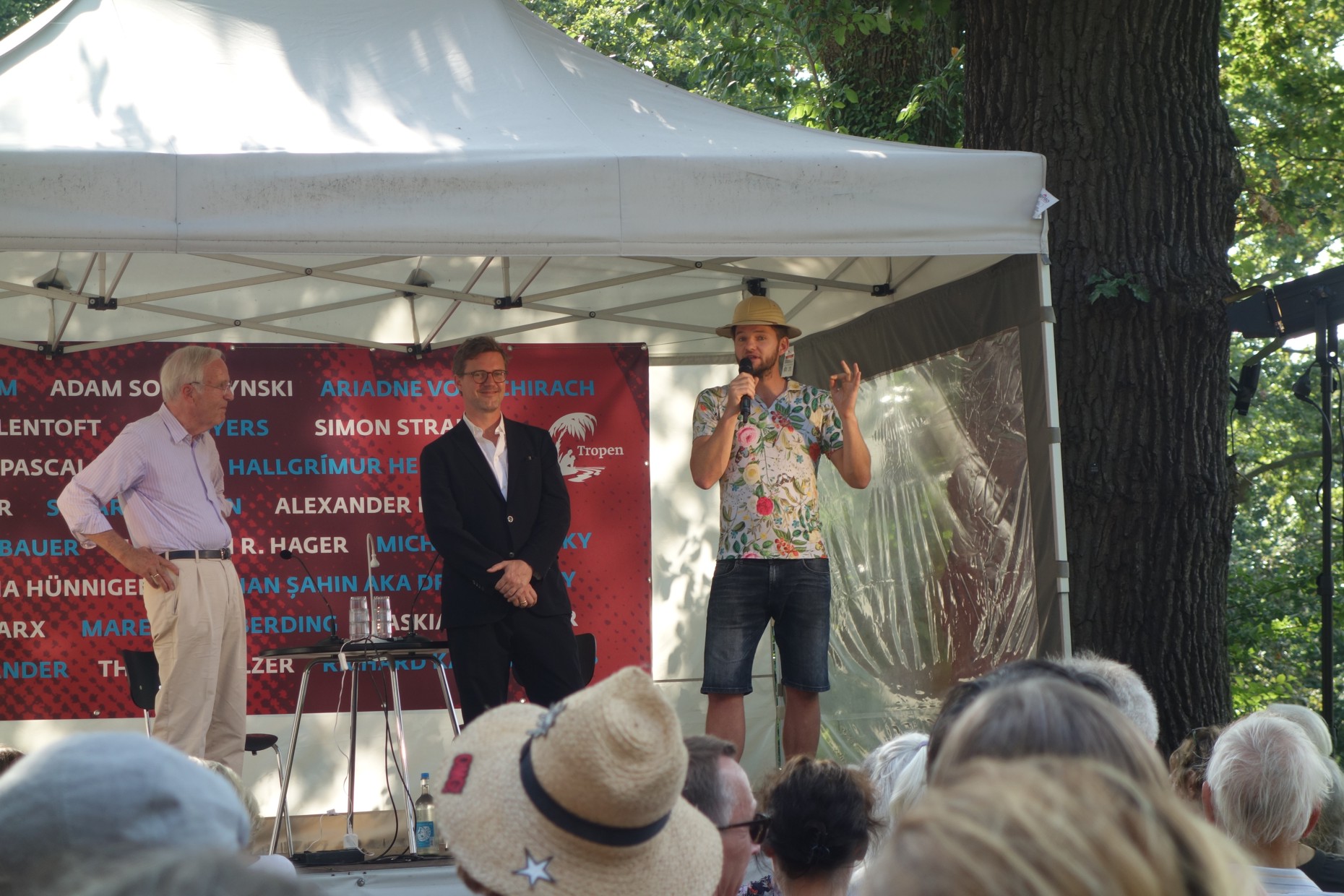 Bereits am frühen Nachmittag begrüßten Tom Kraushaar und Tom Müller zahlreiche Gäste, die trotz der tropischen Hitze von 35 Grad den Weg an den Wannsee gefunden hatten. Klett-Cotta Verleger Tom Kraushaar erwähnte, dass der Verlag bereits 2011 im LCB zu Gast war (wir berichteten). „Heute steht der kleinere, aber schillerndere Tropen Verlag im Mittelpunkt“, sagte er und erinnerte an die 24-jährige Geschichte des Verlags, der 1996 von Michael Zöllner, der gestern ebenfalls unter den Gästen war, in Düsseldorf gegründet wurde und seit 2007 Imprint von Klett-Cotta ist. Anfang dieses Jahres zog der Tropen Verlag unter der Leitung von Tom Müller in die Hauptstadt (wir berichteten über das „Berlin-Opening“). Tom Müller wurde in seiner Begrüßung politisch: Wir alle müssten mehr tun, uns mehr engagieren – gegen Diskriminierung, für den Klimaschutz und für das Zusammenwachsen von Ost und West, forderte er. „Bücher können dabei hilfreich sein.“