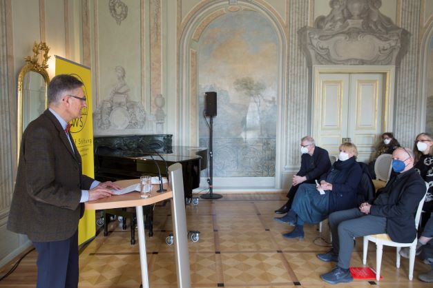 Laudator Heinrich von Berenberg bezeichnete Antje Kunstmann als Verlegerin mit langem Atem und großem Herzen, und er streifte in seinem „Timeslot“ von zwanzig Minuten die Verlagsgeschichte von den Anfängen als „Frauenbuchverlag“ bis heute. Berenberg lobte dabei die eindrucksvolle Variationsbreite des Verlagsprogramms. „Geführt wird es, mit großer Geduld und Hartnäckigkeit, aus einer herzhaft und erfrischend modernen, ständig weiter modernisierten eindeutig linken Perspektive“, sagte er. „Und es ist immer und bis heute beispielhaft international geblieben.“