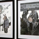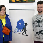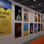 Die Ukraine war in diesem Jahr u.a. mit einem Stand des Ukrainischen Buchinstituts sowie mit einer Ausstellung der Plakate des Pictoric Illustrators Club sichtbar. Dort treffe ich zufällig Gerstenberg-Verlegerin Daniela Filthaut, die mir Romana Romanyschyn und Anrij Lessiw vorstellt, die bereits drei Titel bei den Hildesheimern veröffentlicht haben und mit einem davon, Sehen, im vergangenen Jahr für den Deutschen Jugendliteraturpreis nominiert waren. Ein viertes Buch folgt im Herbst: In Hierhin, dahin. Immer in Bewegung geht es um Mobilität in jeder Form, um Reisen, Migration, Karten, Navigation und darum, den eigenen Weg zu finden. Die beiden Künstler, die in Llwiw das Studio Agrafka betreiben, sind mit einem besonderen Motiv auch in der Pictoric-Ausstellung vertreten.