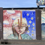 Außer am Messe-Mittwoch, meinem Abreise-Tag, an dem die Busse streiken. Da visualisiere ich eine leichtfüßige Petra Albers, denn von der Verlagsleiterin des Beltz Kinder- und Jugendbuchs wird erzählt, dass sie immer schon zu Fuß aus der Stadt zu den Ausstellungshallen gelaufen ist. Ich stelle sie mir natürlich ohne meinen Koffer und meine Kamera-Tasche vor, und siehe da, auch ich schaffe den Weg und bestaune nebenbei noch Malereien auf der Brücke über die Bahnhofsgleise. Das soll uns die KI erstmal nachmachen.