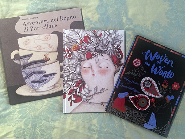 Wie immer habe ich mir in Bologna eine kleine, spontane und rein subjektive Auswahl an Bilderbüchern in der Kinderbuchhandlung Stoppani gegönnt, diesmal bestehend aus Avventura nel Regno die Porcellana (Carthusia) von Katerina Illnerova, S’alza il Vento (logosedizioni) von Anna Paolini sowie dem mit dem Motiv des Webens spielenden Woven of the World (Chronicle Books) von Katey Howes und Dinara Mirtalipova, das eine lobende Erwähnung in der Kategorie Non Fiction der Bologna Ragazzi Awards erhielt.