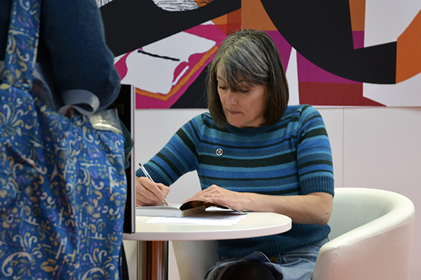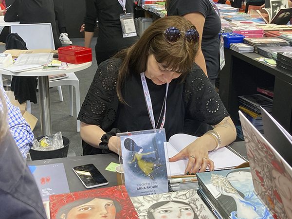 Wir begegnen Linda Wolfsgruber, die am Stand der Schule für Kinderbuchillustration in Sarmede Mappen sichtet. Von ihr werden wir im Herbst u.a. das Bilderbuch Sieben. Die Schöpfung bei Tyrolia sehen, für das sie jeweils sieben Bilder für jeden Tag der Schöpfungsgeschichte gezeichnet hat. Außerdem erscheint bei Jungbrunnen Warum der Mond keine Kleider hat, eine Geschichte, die Linda Wolfsgruber häufig bei ihrer langjährigen Arbeit in Workshops mit Kindergartenkindern in Südtirol erprobt hat.