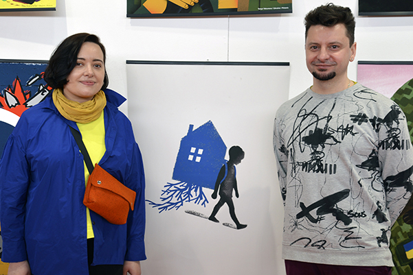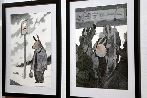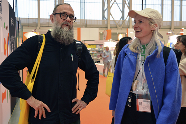 Die Ukraine war in diesem Jahr u.a. mit einem Stand des Ukrainischen Buchinstituts sowie mit einer Ausstellung der Plakate des Pictoric Illustrators Club sichtbar. Dort treffe ich zufällig Gerstenberg-Verlegerin Daniela Filthaut, die mir Romana Romanyschyn und Anrij Lessiw vorstellt, die bereits drei Titel bei den Hildesheimern veröffentlicht haben und mit einem davon, Sehen, im vergangenen Jahr für den Deutschen Jugendliteraturpreis nominiert waren. Ein viertes Buch folgt im Herbst: In Hierhin, dahin. Immer in Bewegung geht es um Mobilität in jeder Form, um Reisen, Migration, Karten, Navigation und darum, den eigenen Weg zu finden. Die beiden Künstler, die in Llwiw das Studio Agrafka betreiben, sind mit einem besonderen Motiv auch in der Pictoric-Ausstellung vertreten.