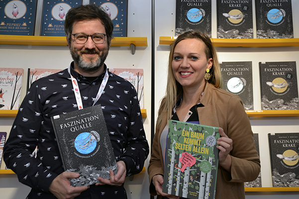Am österreichischen Gemeinschaftsstand treffen wir Tanja Raich und Bernd Thurner vom Leykam Verlag, in dem seit noch nicht langer Zeit ein Kinderbuch-Programm aufgebaut wird, das bereits Erfolge feiern kann, allen voran mit dem Sachbuch Faszination Krake von Michael Stavarič und Michèle Ganser, das diverse Preise einheimsen konnte. Jüngst nachgelegt hat man mit dem zweiten Band, Faszination Krake.