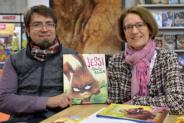 Bei Coppenrath kommt ein neues Buch des Dream-Teams Kai Lüftner und Wiebke Rauers: Jessi, die Raubhäsin, ist eine rebellische Figur, die zunächst lieber auf sich allein gestellt verschiedenen Tieren im Wald in brenzligen Situationen hilft, sich schließlich aber doch mit dem Wehr-Schwein anfreundet. Nicola Dröge, Programmleiterin Kinder- und Jugendbuch, und Geschäftsführer Lambert Scheer sind von dem Titel so überzeugt, dass sie ihm ein Plüschtier in der Spiegelburg zur Seite stellen und einzig aus Solidarität mit ihrer neuen Bilderbuch-Heldin für einen kurzen Moment grimmig in die Kamera gucken.