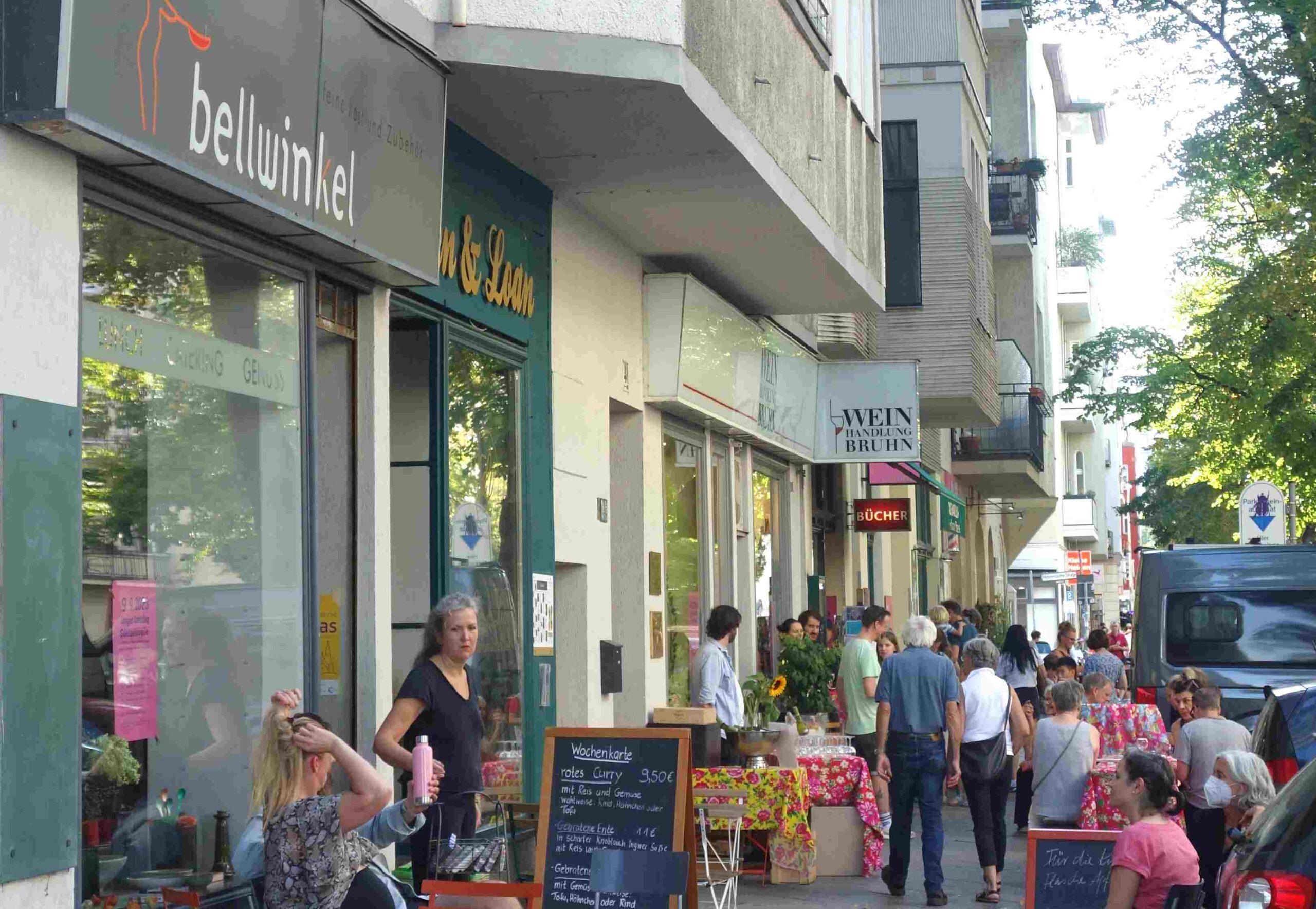 In den Pausen gab es Musik vor den Geschäften, Häppchen beim Käsehändler und Bratwurst vor der Fleischerei. Getränke servierte die Weinhandlung und die Sträuße für die Autorinnen und Autoren spendierte die Blumenhandlung im Güntzelkiez. „Es gab sehr viele positive Rückmeldungen“, freut sich Hanne Schatzer. „Bei dem Fest geht es uns und den anderen Geschäften nicht um Gewinnm