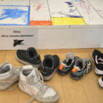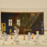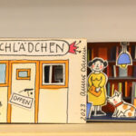 Das Bühnenbild für diesen im Eingangsbereich präsentierten Raum wurde von Lena Sofuoglu entworfen. Praktisch umgesetzt hat es, wie viele andere Details der Werkschau auch, der ehemalige Hausmeister des Bilderbuchmuseums, Peter Reim. Antje Damm zeigte sich bei der Eröffnung gerührt und dankbar für die Gestaltung der Ausstellung. Denn ihr sei besonders wichtig gewesen, dass Kinder hier nicht „nur“ Bilder sehen, sondern auch selbst kreativ werden können – auf sie warten noch zahlreiche andere Mitmach-Möglichkeiten –, und dass Vitrinen für sie in Augenhöhe bereitgestellt werden.