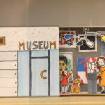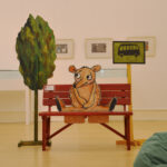 Die in unterschiedlichen Techniken entstandenen Bilder – vom klassischen Zeichnen über Collagen bis hin zu dreidimensionalen Darstellungsformen aus Papier oder Holz – erhalten in der Ausstellung jeweils ihren eigenen Auftritt. Zu Der Besuch (Moritz Verlag), dem ersten Titel, für das Antje Damm Kulissen und Figuren aus Papier schuf, wurde eigens ein Zimmer nachgebaut, das von kleinen und großen Ausstellungsbesucher:innen nach und nach bemalt werden kann – angelehnt an die Bilderbuchgeschichte, in der ein kleiner Junge das eintönige Leben einer älteren Frau immer mehr mit Farbe füllt.