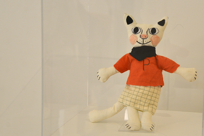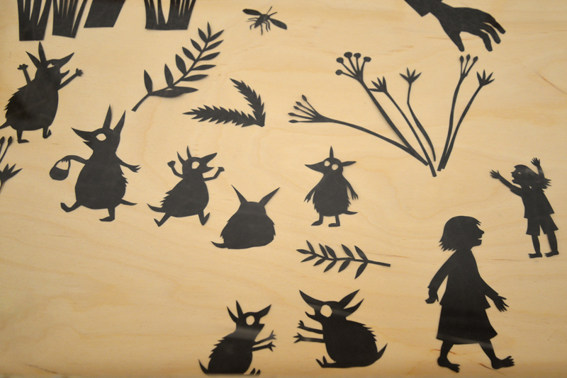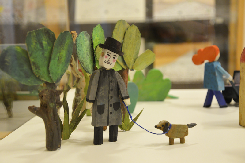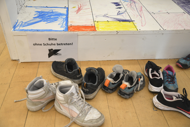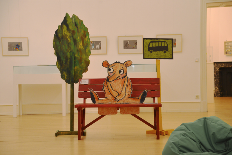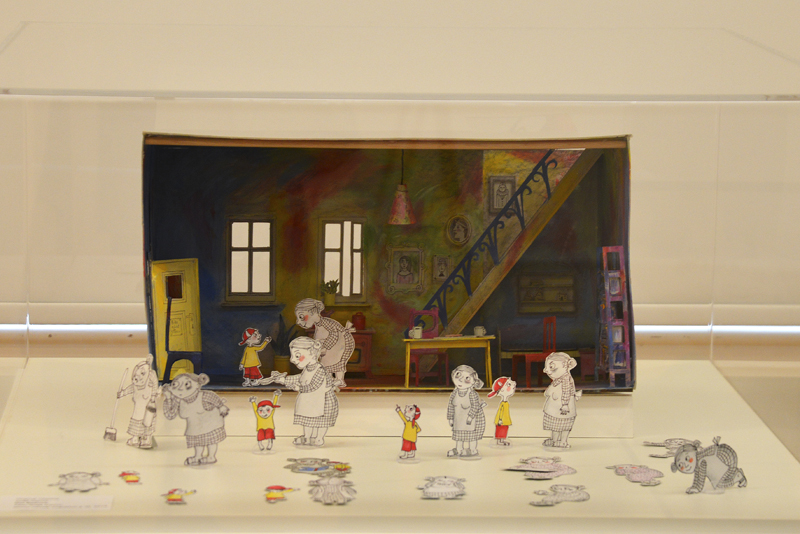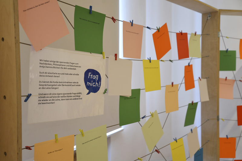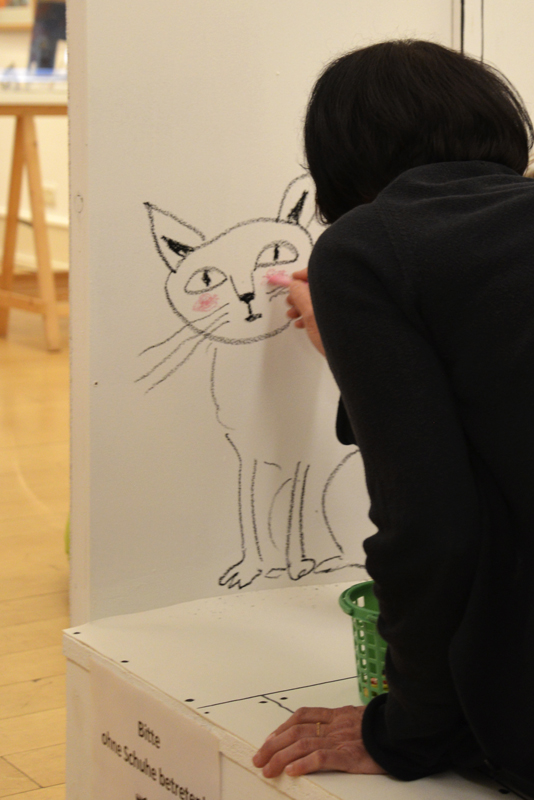 Das Bühnenbild für diesen im Eingangsbereich präsentierten Raum wurde von Lena Sofuoglu entworfen. Praktisch umgesetzt hat es, wie viele andere Details der Werkschau auch, der ehemalige Hausmeister des Bilderbuchmuseums, Peter Reim. Antje Damm zeigte sich bei der Eröffnung gerührt und dankbar für die Gestaltung der Ausstellung. Denn ihr sei besonders wichtig gewesen, dass Kinder hier nicht „nur“ Bilder sehen, sondern auch selbst kreativ werden können – auf sie warten noch zahlreiche andere Mitmach-Möglichkeiten –, und dass Vitrinen für sie in Augenhöhe bereitgestellt werden.