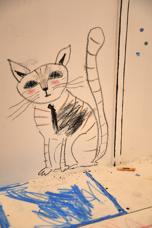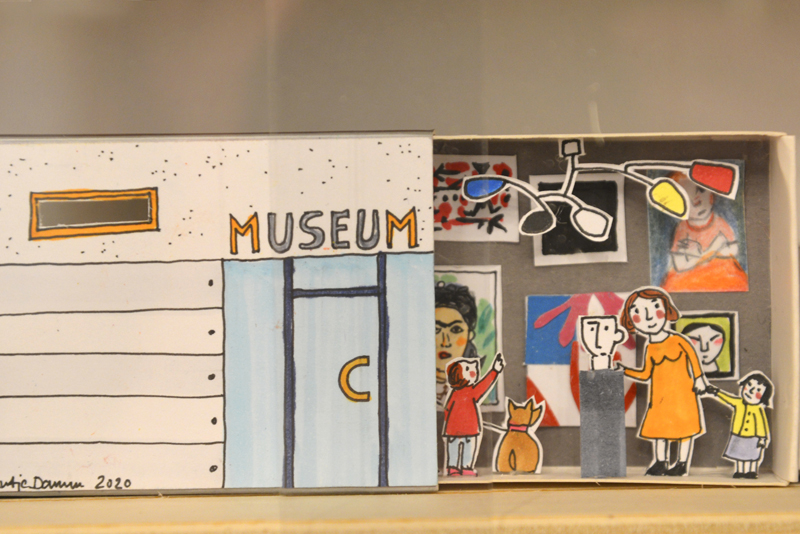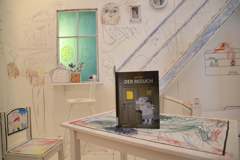 Die in unterschiedlichen Techniken entstandenen Bilder – vom klassischen Zeichnen über Collagen bis hin zu dreidimensionalen Darstellungsformen aus Papier oder Holz – erhalten in der Ausstellung jeweils ihren eigenen Auftritt. Zu Der Besuch (Moritz Verlag), dem ersten Titel, für das Antje Damm Kulissen und Figuren aus Papier schuf, wurde eigens ein Zimmer nachgebaut, das von kleinen und großen Ausstellungsbesucher:innen nach und nach bemalt werden kann – angelehnt an die Bilderbuchgeschichte, in der ein kleiner Junge das eintönige Leben einer älteren Frau immer mehr mit Farbe füllt.