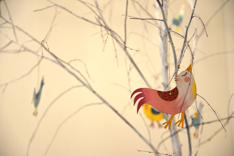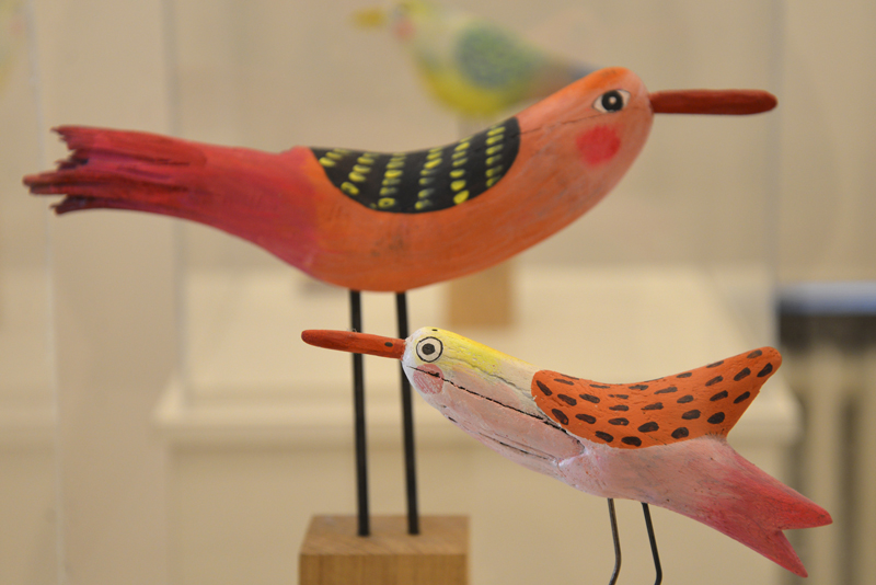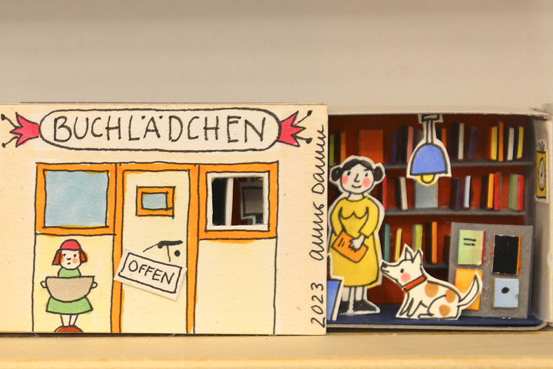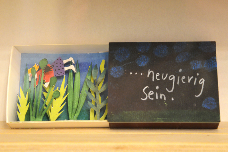Neben Buchillustrationen sind auch freie Arbeiten zu sehen, wie die Streichholzschachteln, in die die Künstlerin kleine Welten aus Papier installiert, außerdem Vögel aus Papier oder Holz sowie eine Pizzakatze aus Stoff, die zum gleichnamigen Bilderbuch im Peter Hammer Verlag gehört – dafür hatte Antje Damm erstmals den Text eines anderen Autors illustriert: Will Gmehling war ebenfalls zur Vernissage angereist.