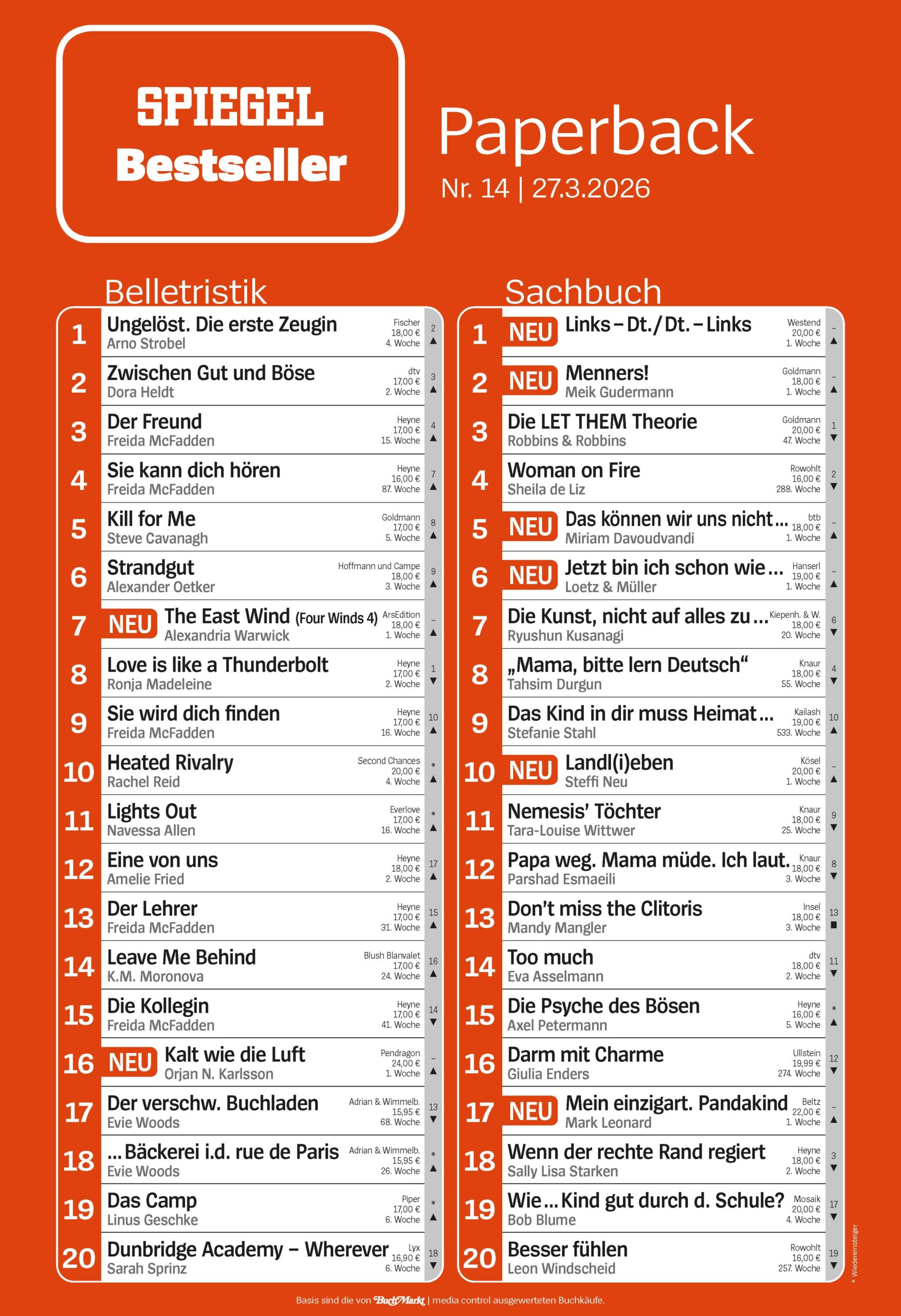 - wöchentlich Bestseller Belletristik und Sachbuch Paperback, Medienpartner DER SPIEGEL