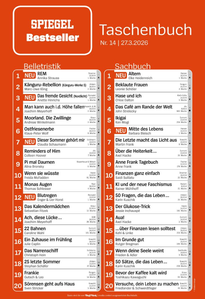 - wöchentlich Bestseller Belletristik und Sachbuch Taschenbuch, Medienpartner DER SPIEGEL