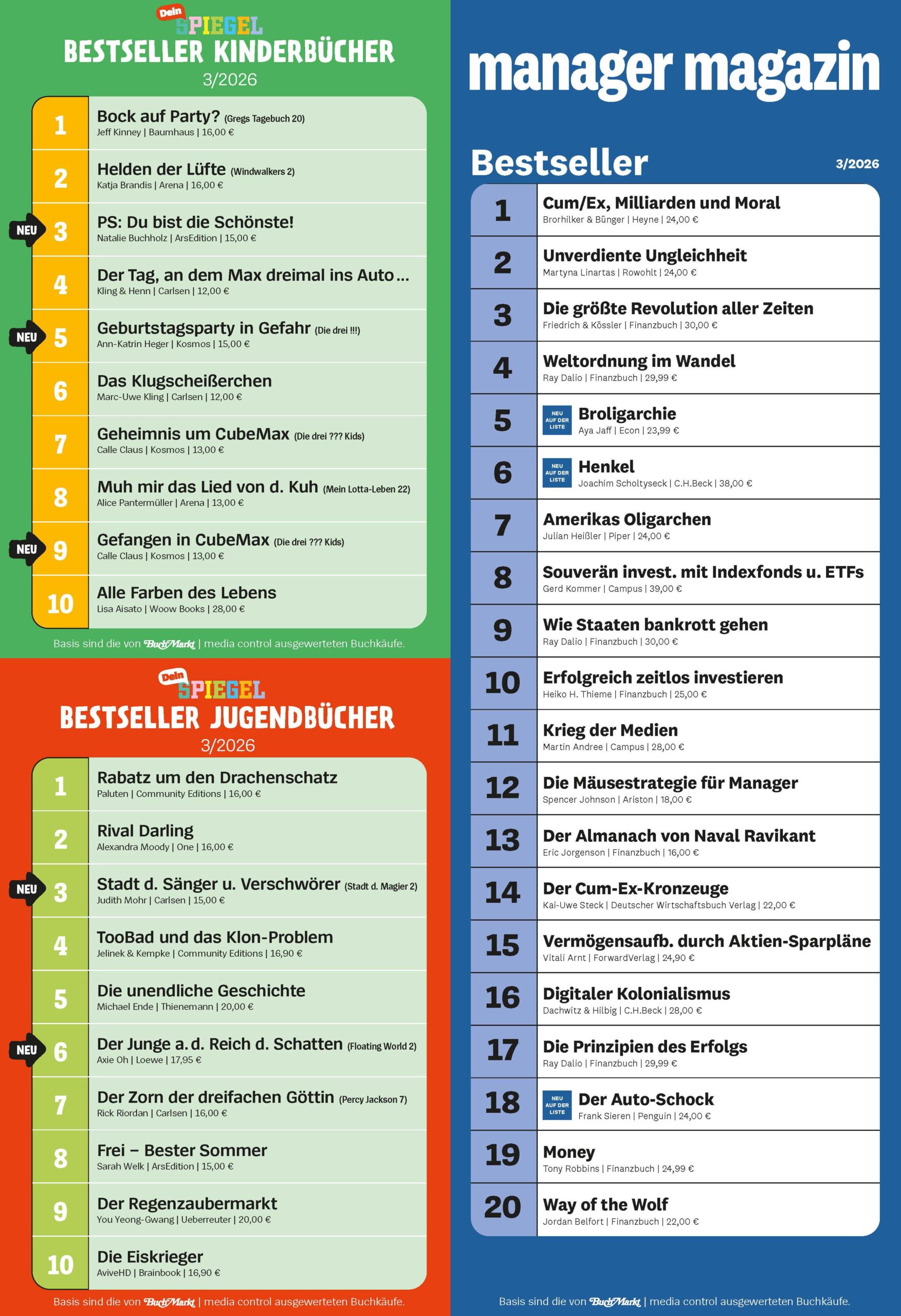 Abverkäufe Kalenderwoche Montag bis Sonntag -> Ermittlung in der Folgewoche montags -> Veröffentlichung Top 20 b2b auf buchmarkt.de -> Veröffentlichung b2c spiegel.de Donnerstag (gültig seit 03.07.2025) -> Veröffentlichung b2c Der SPIEGEL print Freitag (gültig seit 03.07.2025)
