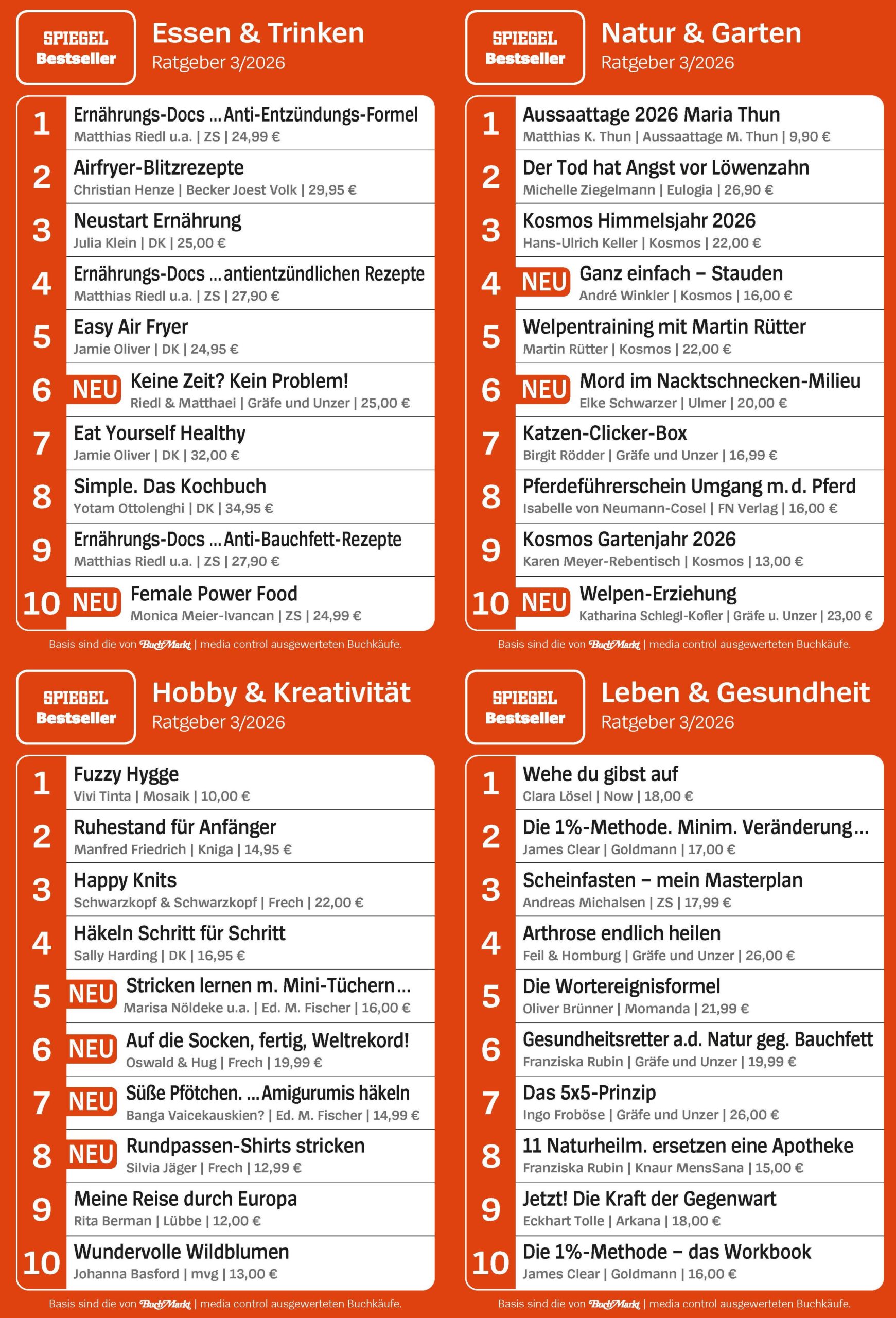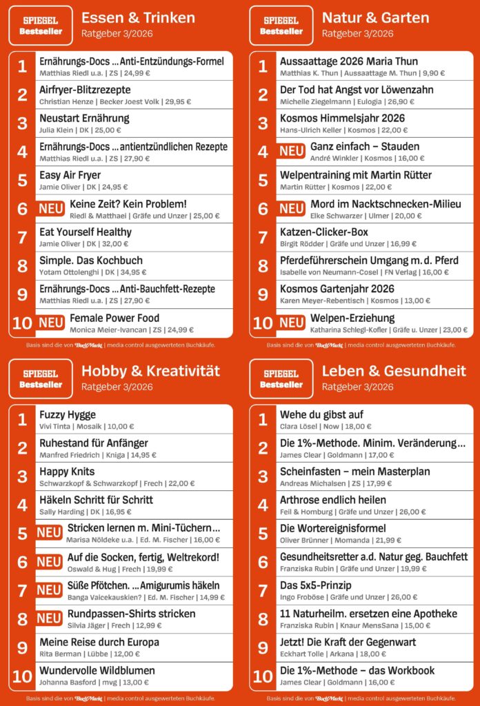 - SPIEGEL Bestseller Ratgeber Top 10: Essen & Trinken, Natur & Garten, Leben & Gesundheit, Hobby & Kreativität